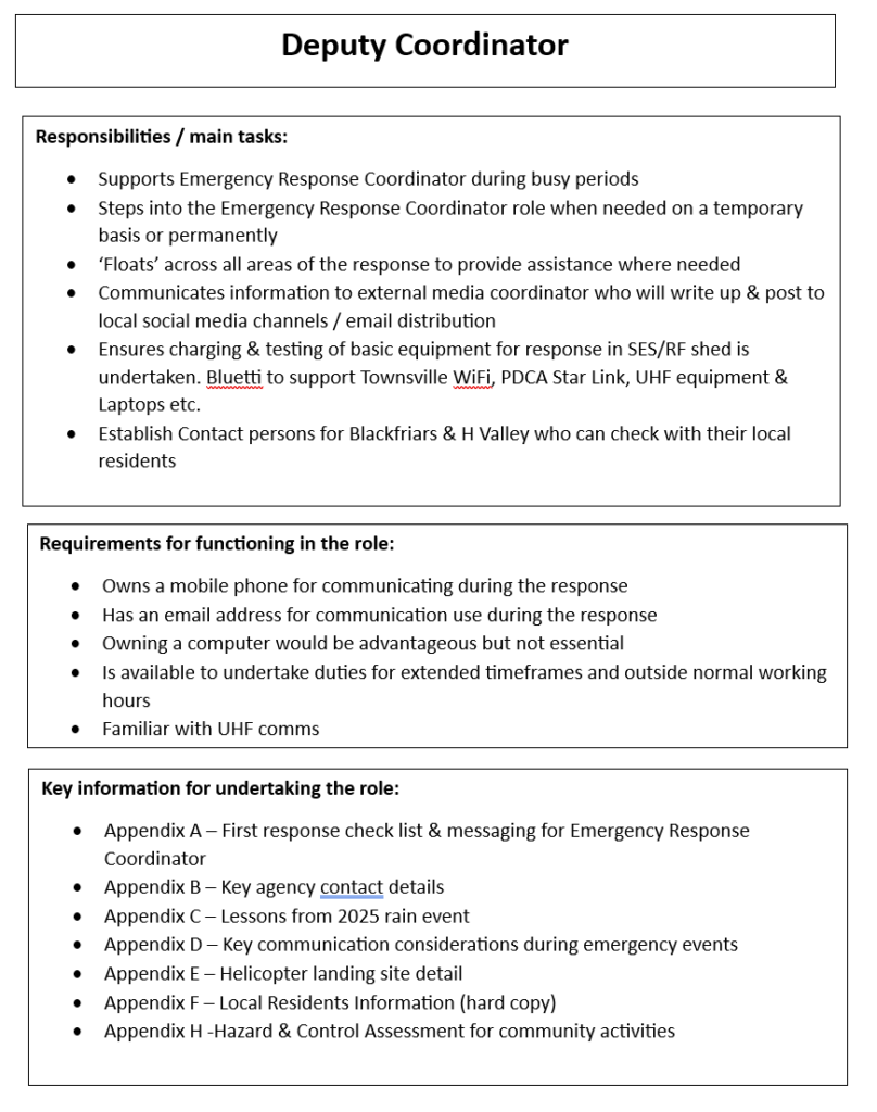 The basis of this plan has been built on emergency responses undertaken during previous disaster events in the area, including the recent 2025 Ingham flood event. The emergency action plan should be reviewed and updated on a yearly basis and following a recent disaster event so that lessons learnt can be incorporated.
