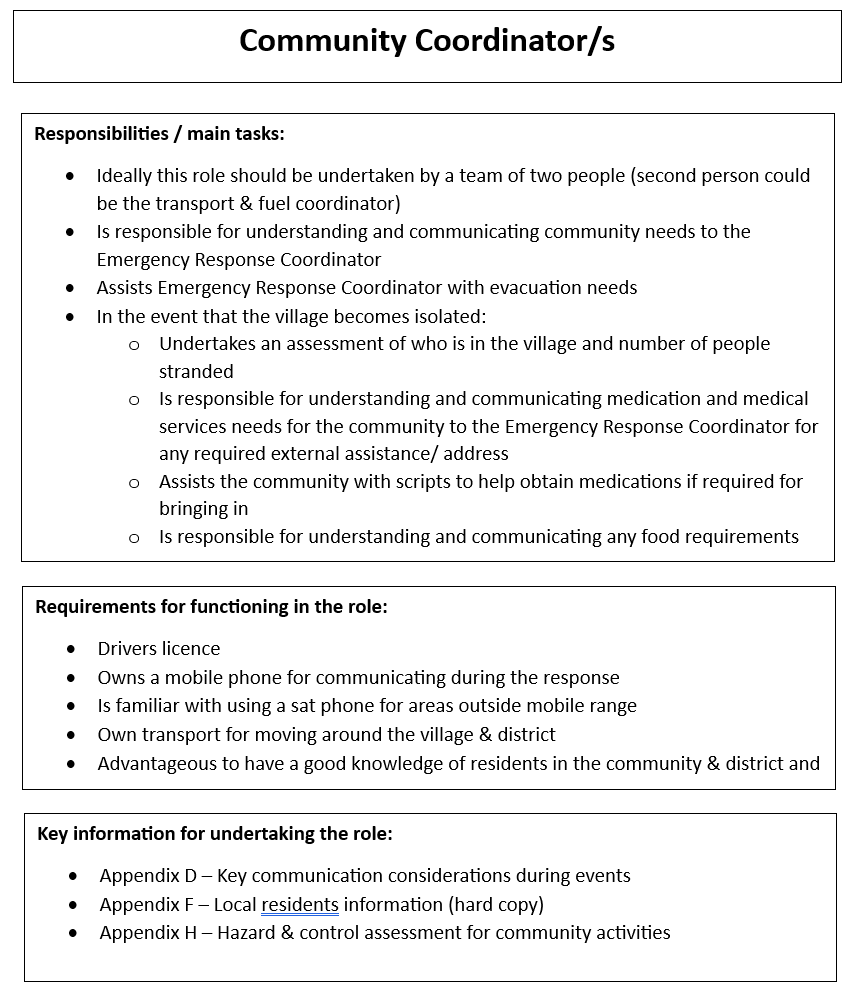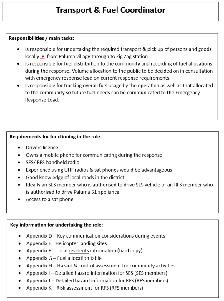 The plan is inclusive of scenarios where there may or may not be SES / RFS members present in the village during the disaster.