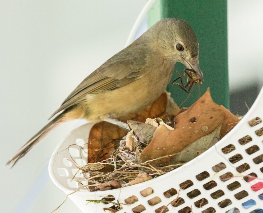 Insects make up the bulk of the Little Shrike-thrush’s diet. A plate of mealworms in our garden, once discovered, is rapidly consumed on the spot, except during breeding season, when I have seen one bird stuff up to five mealworms in its beak and then fly off to a nest hidden somewhere in the trees. While I have never seen it at our bird seed dispenser or our parrot and honeyeater buffet of fruit and date syrup, Little Shrike-thrushes are known to occasionally consume both.