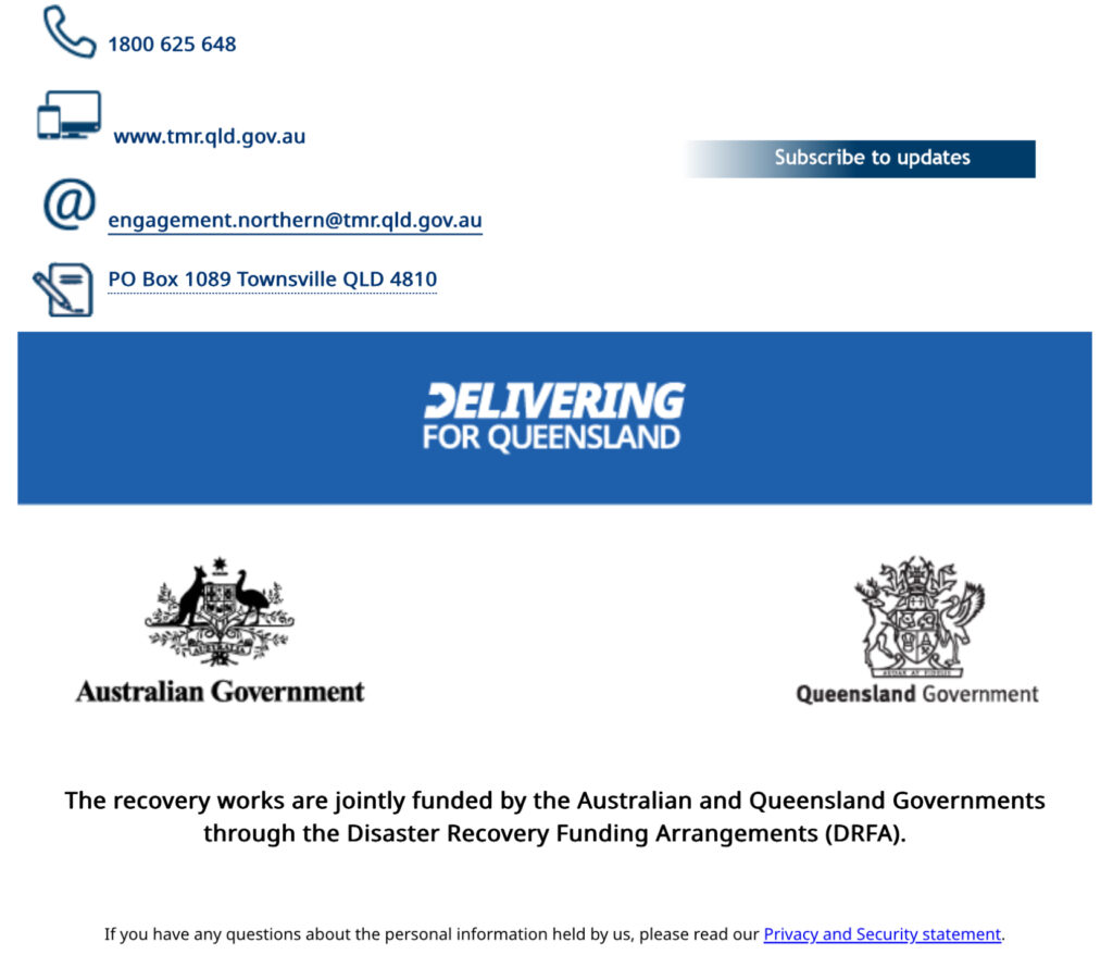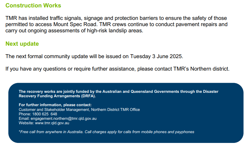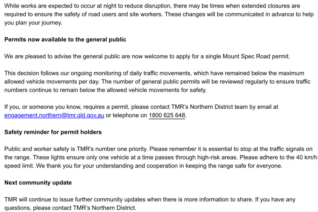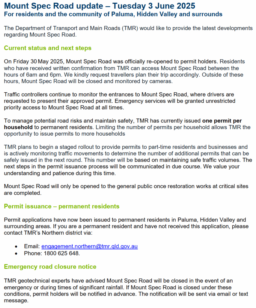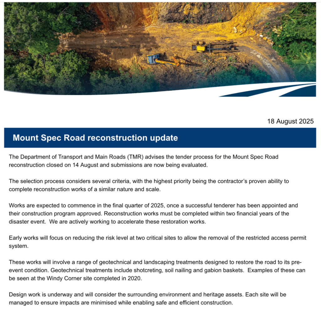 Recently, David Roveda wrote to TMR asking them for information relating to the tenders that have been invited for work on repairing the damage to the Range Road. His questions are highly relevant to the broader Paluma community and its concerns about timelines for full opeing of the range road. David has suggested that the resulting exchange be published on Paluma.org. In David’s words: